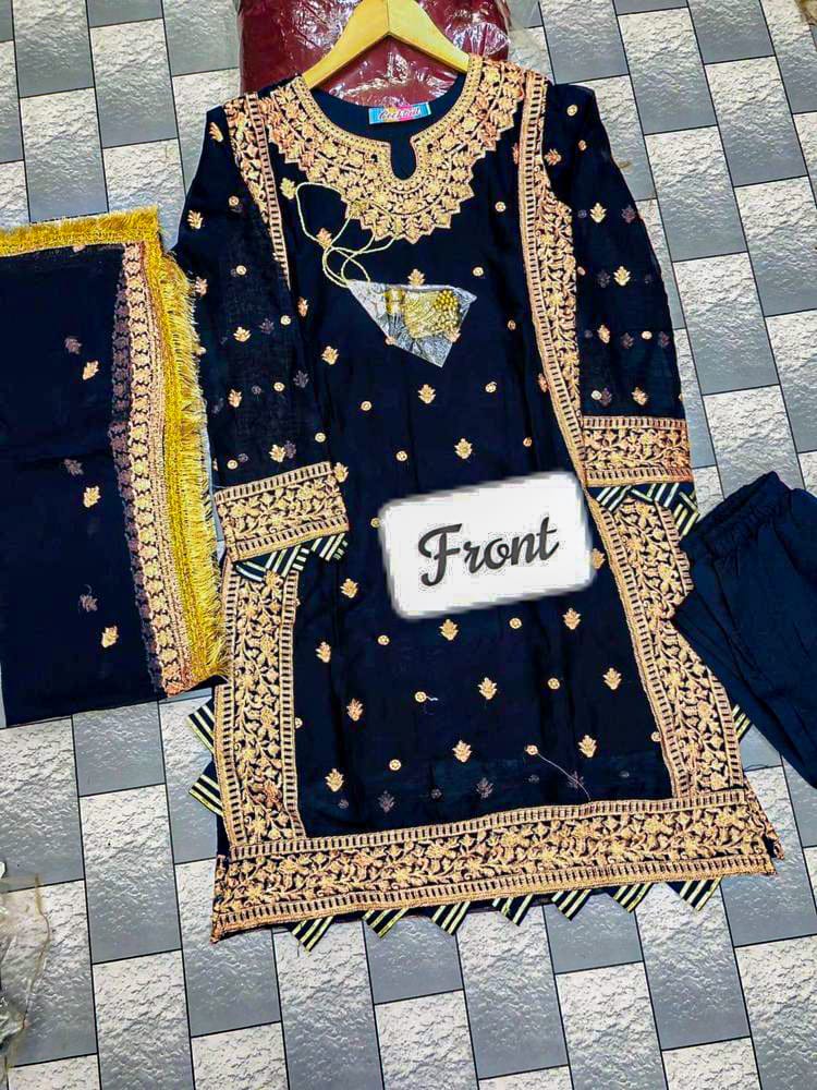 Enhance your style with this elegant 3-piece crinkle chiffon embroidered suit, designed for comfort, grace, and a luxurious look. Perfect for parties, festive events, and formal wear.