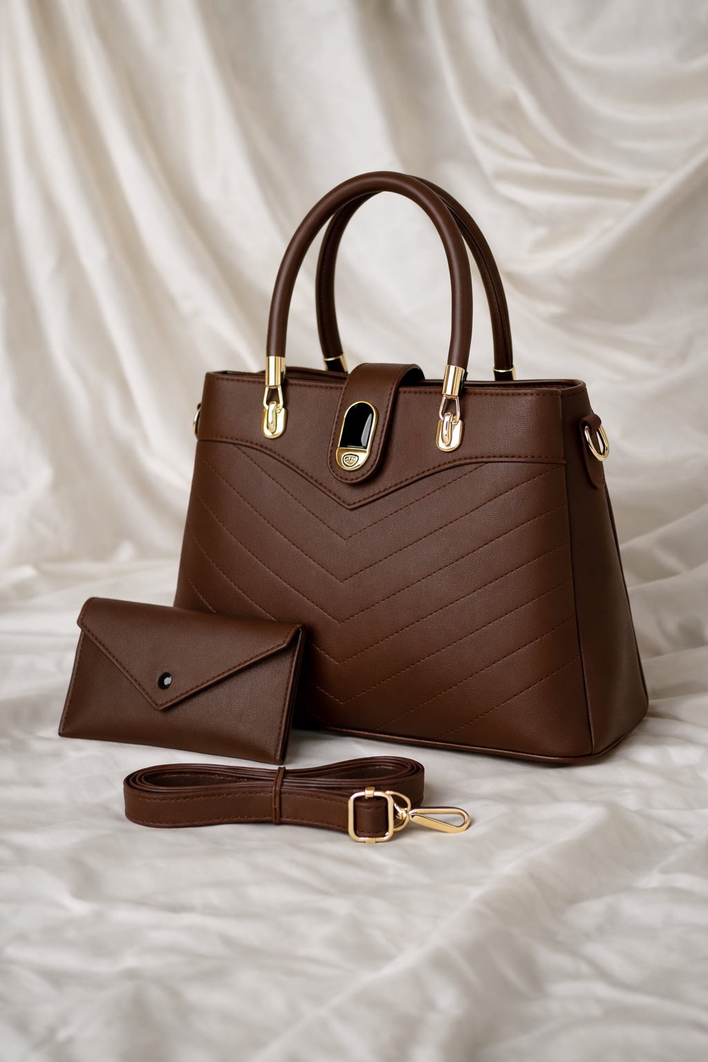 Girls’ Leather Plain Hand Bag Set – Brown (2 Pcs)